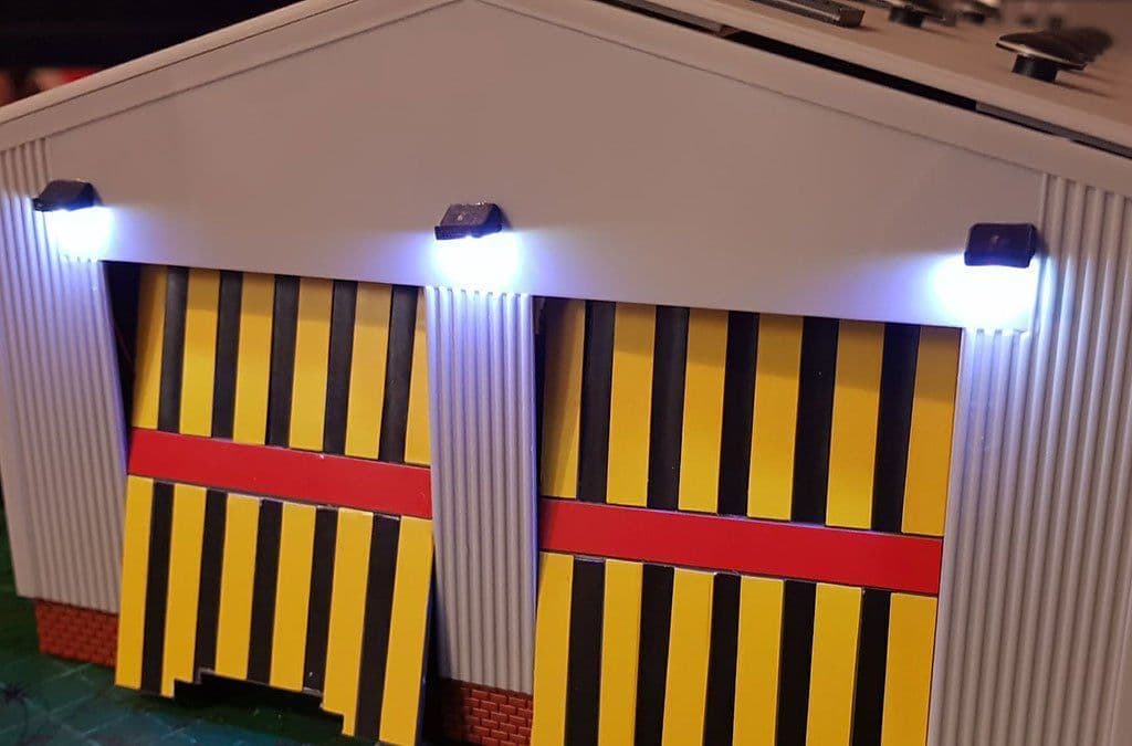 A pack of 6, high quality 3D printed Wall Mounted Floodlights with working LEDs in OO / 1:76 scale. Printed in black PLA, and supplier with pre-wired micro LEDs and ultra fine wire. Primarily designed as a retrofit upgrade to the GM406 Fordhampton Diesel Depot, but can be fitted to virtually any industrial or railway building. Just drill a hole, feed the wires through, glue into place and then connect them up. Can be powered directly from a 3v supply, or with the use of the included resistor they can be operated from a 12 to 16v ac or dc supply. Available in a choice of bright white, or orange (to simulate older sodium lamps).