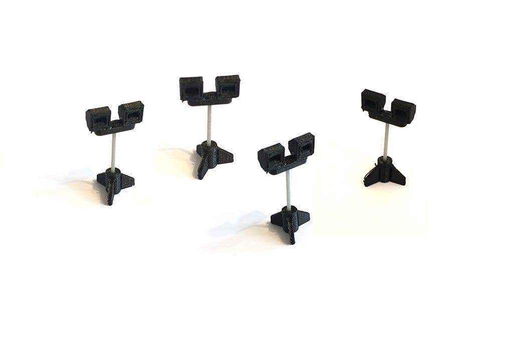 A self-assembly 3d printed plastic kit to make 4 twin head portable work lights, suitable for use in workshop dioramas, maintenance depots and on building/construction sites. Heads can be positioned as required during assembly. Supplied unpainted and printed in grey & black PLA. Assembly required. Can be painted with acrylic paints as required.