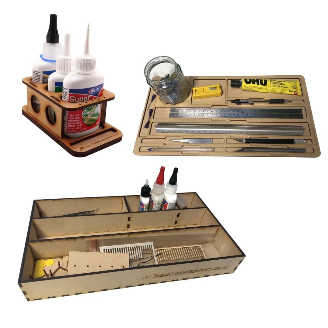 Glue stands: To prevent any accidental spillage of any open glue bottles on your modelling workbench, a glue bottle holder is worth considering. It will prevent any accidents by holding the glue bottles securely. Our SX025 Deluxe Materials Glue Stand is really useful for 3 bottles of the same size, in particular Roket Glue/Glue'n'Glaze/Super Phatic, or three of each.