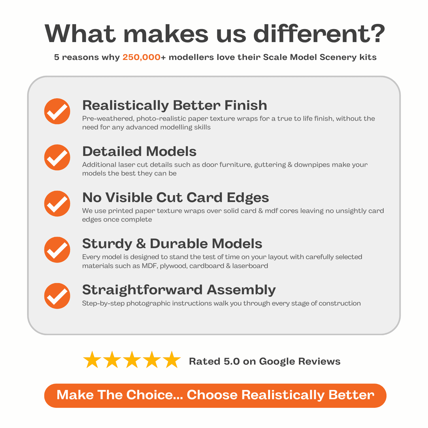 The kit is supplied with laser-cut parts for ease of assembly with no additional painting or weathering required on the main components for a "Realistically Better" finish straight from the pack. Only the windows, doors & downspouts are supplied unpainted so you can choose your own colour scheme for those.