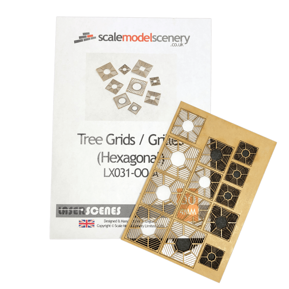 A pack of laser cut decorative assorted sized Tree Grids / Grilles, ideal for use around trees and bushes that are to be planted in pathways & pedestrian areas on your model railway layout or diorama. Precision cut from 0.4mm laserboard and supplied in natural brown colour, ready for painting (artists acrylics are perfect for the job). Packs contain 4 of each size in a choice of three designs.