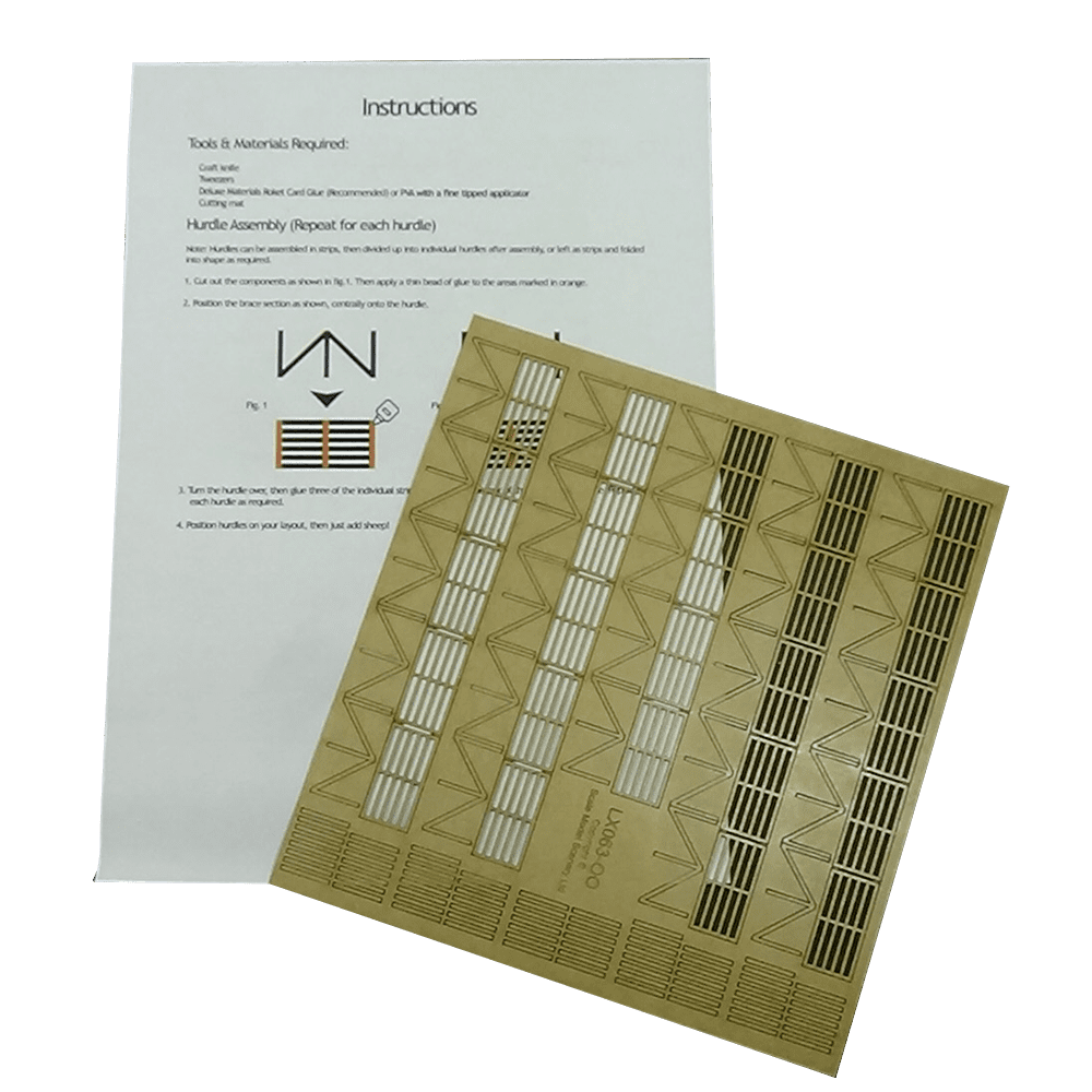 A set of laser cut OO scale sheep hurdles / sheep pens. This pack makes up to 24 individual hurdles which can be assembled in strips, then folded into pens, or individually and arranged as required. Straightforward to assemble, with full instructions included.*Sheep Not Included!