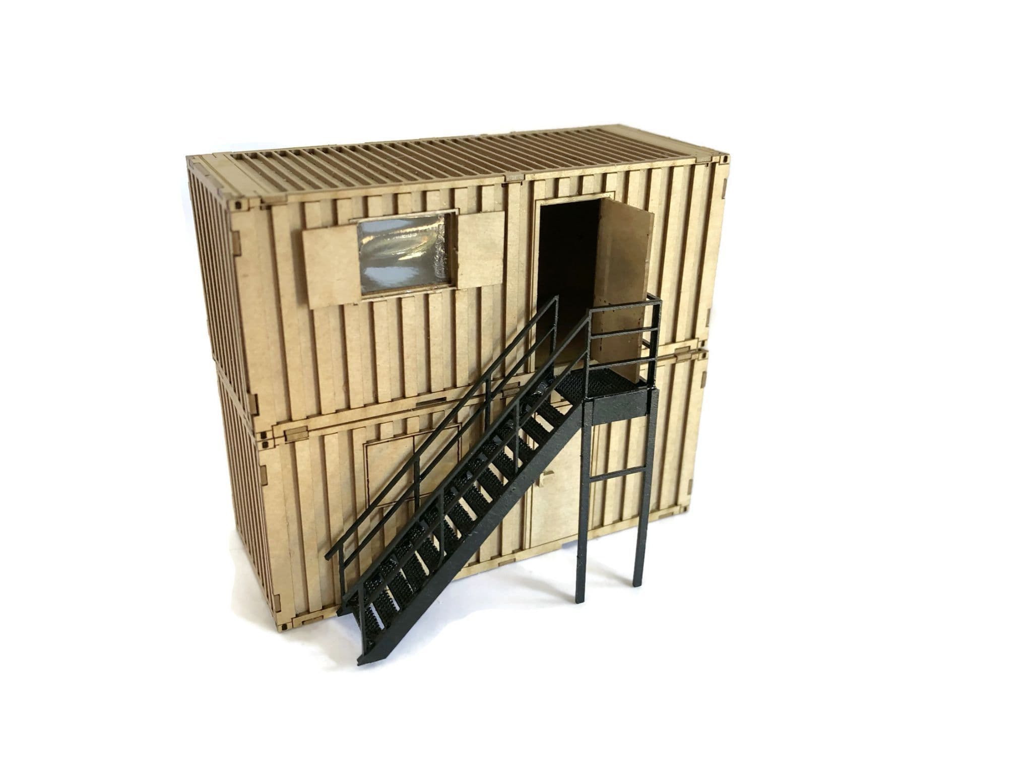 A pack of 2 laser cut, self-assembly, 20ft shipping container site offices plus steel staircase for OO gauge model railway layouts and 1:76 scale diecast dioramas. Easy to assemble layered box construction & packed with lots of detail including side windows and doors which can be posed in open or closed positions. Ideal for busy depots, yards & construction sites and even works well as a gatehouse. Precision cut from 0.8mm laserboard and supplied unpainted.