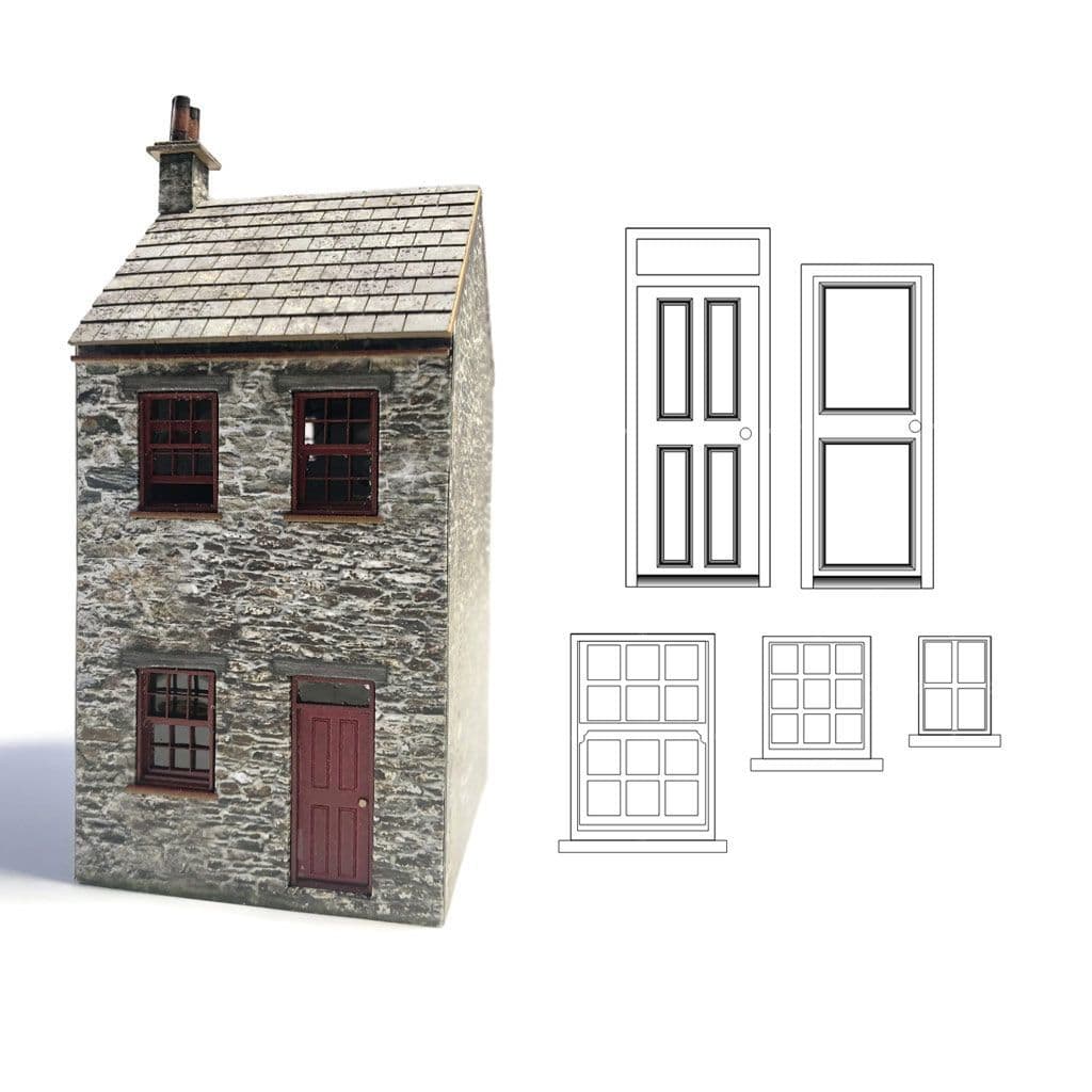 A pack of assorted laser-cut windows and doors for a single terraced house. Supplied as a self-assembly kit with simple, layered parts to give a realistically better finish to your scratch-built terraced houses and shops. Marking/Cutting template included.