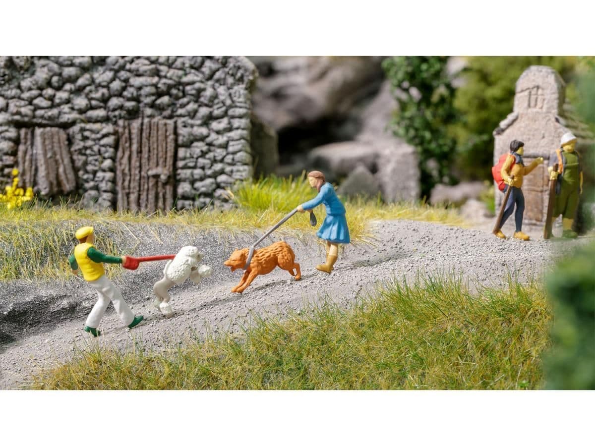 Hand-painted figure set featuring two dogs out for a walk, barking at each other. Part of the Funny Scenes OO/HO scale range by Noch. Ideal for detailing model railway layouts and dioramas.