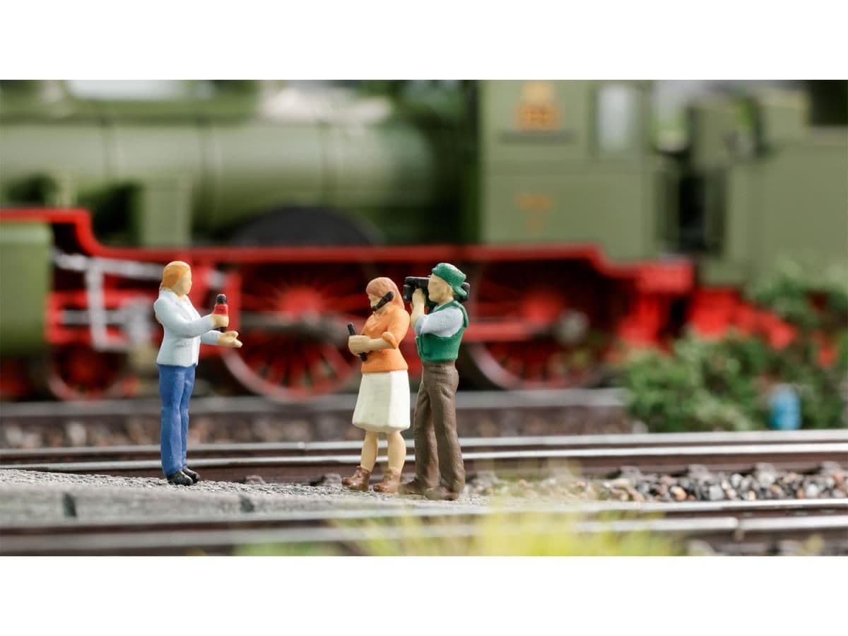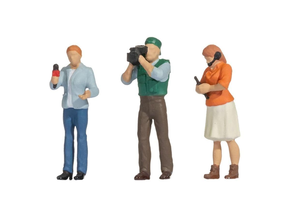 Hand-painted figure set featuring TV reporters out on location. Part of the Funny Scenes OO/HO scale range by Noch. Ideal for detailing model railway layouts and dioramas.