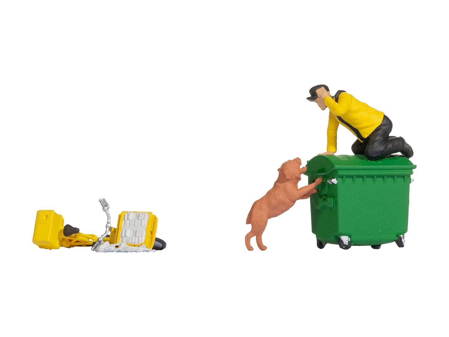 Hand-painted figure set featuring delivery person on top of a wheelie bin while being chased by an angry dog. Part of the Funny Scenes OO/HO scale range by Noch. Ideal for detailing model railway layouts and dioramas.