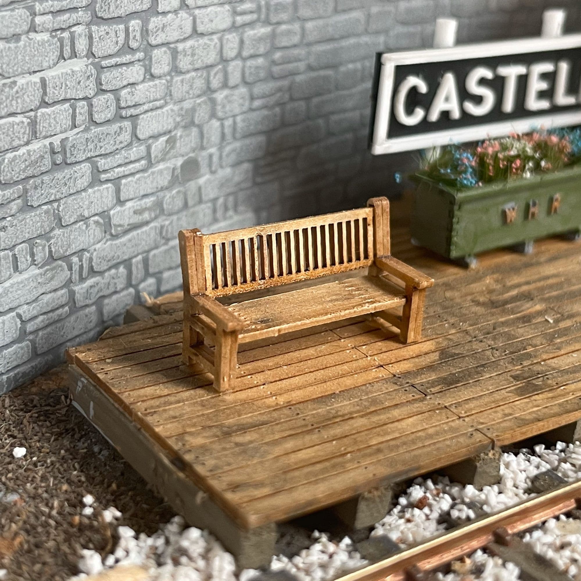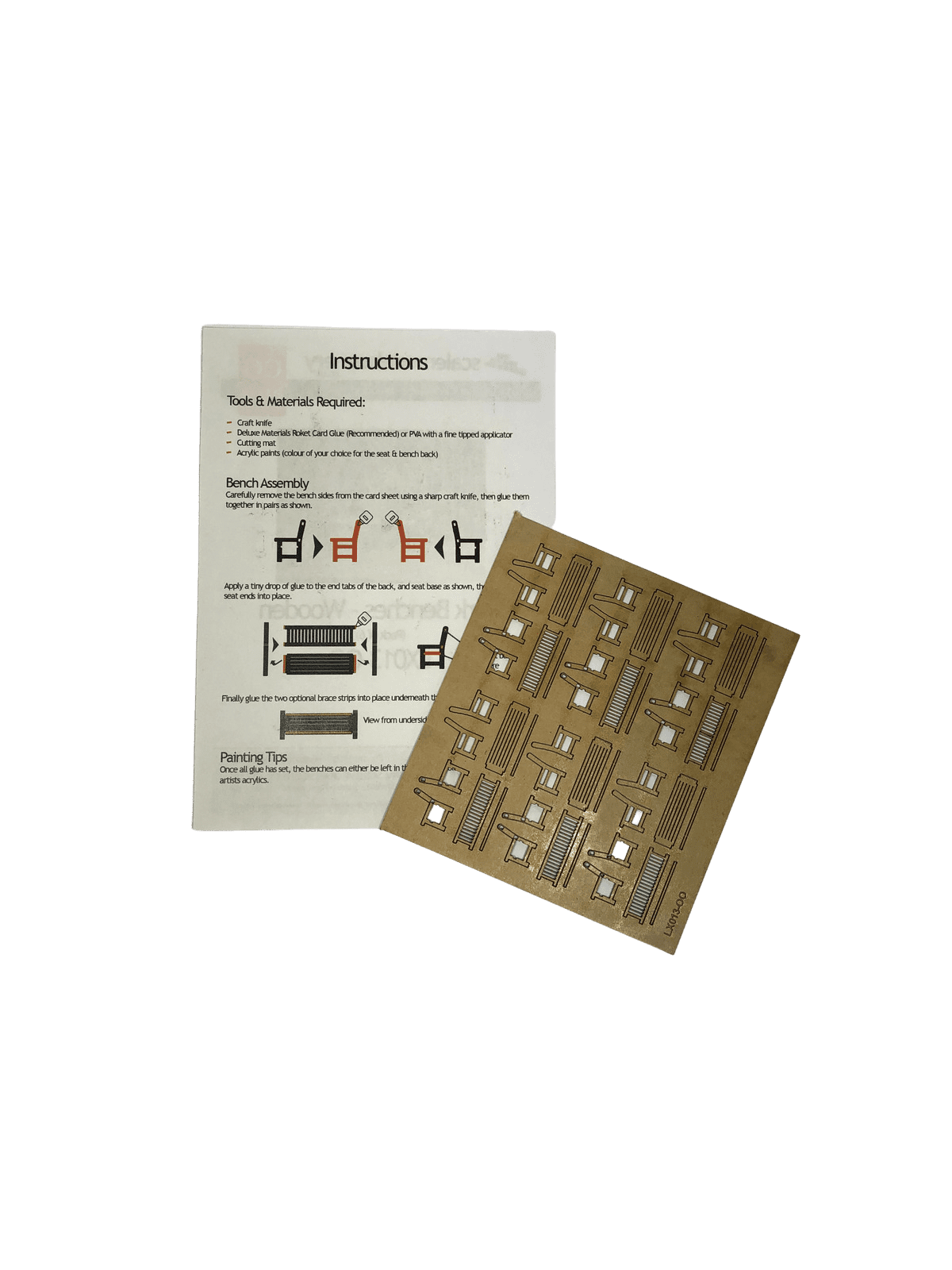 A pack of 3 or 6, self-assembly laser cut, wood effect park or platform benches. Straightforward to assemble, these benches have a wide range of uses on your OO scale model railway layouts or 1:76 diecast dioramas. An essential piece of street furniture, ideal for use as platform seating, park benches or seating in pedestrian areas. Supplied pre-cut from 0.8mm brown laserboard, there's enough parts to build 3 or 6 benches (depending on pack size chosen) of the design shown in the photos above. Can be easily painted in your chosen colours using artists acrylics (Note: The bench in the photos has been painted brown).