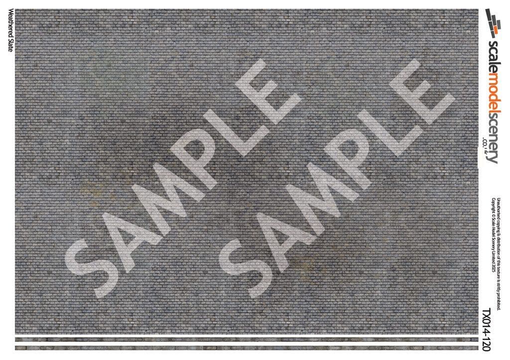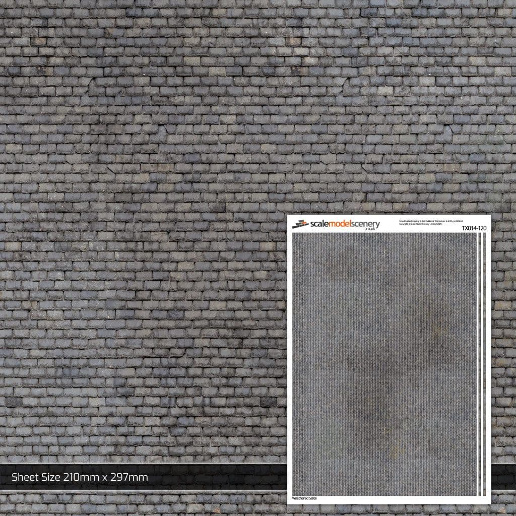 A pack of 5 A4 sheets (210mm x 297mm) of photo-realistic, Weathered Slate Roofing paper texture sheet. Ideal for scratch-building architecture on your TT:120 scale model railway and 1:120 model dioramas.