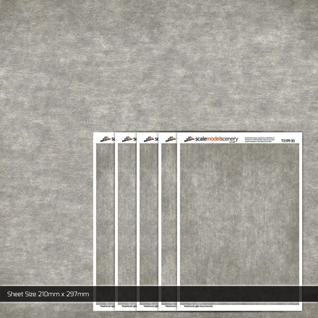 A pack of 5 A4 sheets (210mm x 297mm) of photo-realistic, weathered light-grey concrete paper paper. Ideal lorry yards, depots, warehouses, container yards etc on your 1:50 scale diecast dioramas.