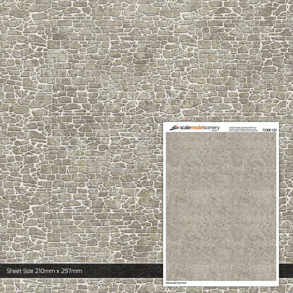 A pack of 5 A4 sheets (210mm x 297mm) of photo-realistic, lightly weathered, pointed light grey stone brick paper. Featuring individually rendered stones, this texture is perfect for a wide variety of rural buildings such as houses, shops, railway buildings and walls.